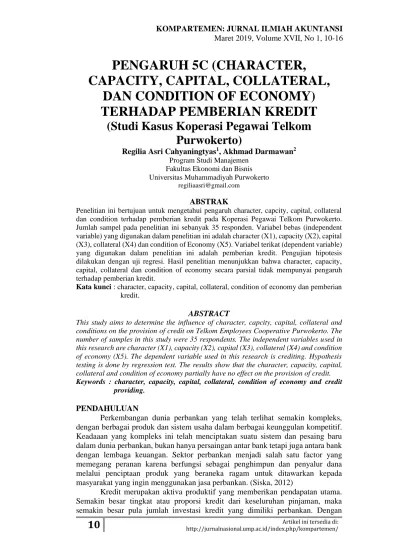 (studi kasus pada bank sumut cabang syariah. Siregar, elfi rahmayani (2017) analisis implementasi 5c pada pembiayaan murabahah (studi kasus pada bprs bandar lampung). 5c + 1s dalam melakukan analisis terhadap calon nasabah pembiayaan. Akan dipikulnya dalam setiap kasus dan berapa jumlah pembiayaan. (studi kasus di kspps bmw rahmah jatim kota kediri).
