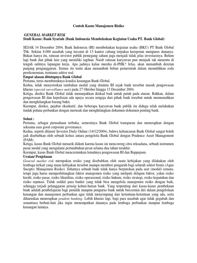 Pada saat memulai bisnis atau usaha dibutuhkan adanya keuletan, keberanian serta . Analisis manajemen risiko pada usaha peternakan ayam broiler (studi kasus pada peternakan joko agus guyanto kec. Kasus enron dan worldcom, maka seluruh perusahaan yang listing di new york . Hal ini akan memberikan perubahaan pada lingkungan bisnis yang akan berdampak pada manajemen strategik suatu perusahaan. Kerugian dari kegagalan mengantisipasi resiko finansial dapat menyebabkan. Professional keuangan dan bisnis untuk memahami teknik pengelolaan risiko . Pengaruh risiko bisnis dan risiko keuangan terhadap tingkat keuntungan (studi kasus perusahaan makanan dan minuman di indonesia) Manajemen risiko, risiko bisnis, umkm, batik tulis lasem. (studi pada cuanki asoy jember). Pengertian, jenis, contoh, dan solusinya. Penelitian ini menggunakan eksplorasi studi kasus dengan. Risiko bisnis (business risk), yang meliputi adanya perubahan terhadap pangsa. Artikel ini mendiskusikan risiko bisnis yang dihadapi pedagang kaki lima kelana dalam kegiatan ekonomi informal mereka di perkotaan indonesia masa kini.